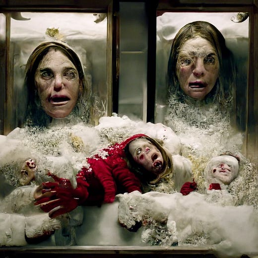 What is going on here? We can probably chalk at least some portion of the thread’s creepiness to motivated pattern-matching and wishful thinking on our parts. While the images in this email are curated for maximal Loabness, if you look through Supercomposite’s thread, you’ll find lots of images that are extremely unsettling -- but in which the figures are not particularly Loab-y. (Especially if you’re feeling like a spoilsport.) Bits and pieces of Loab (especially her hair) might persist through some transformation, but I’m not sure it should be entirely surprising that if you keep asking an AI to combine an image of a creepy-looking woman with another image, bits and pieces of the creepy-looking woman will persist, even across multiple prompts.