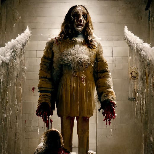 Still, Supercomposite is on to something here: Who is this woman? Why is she produce by negative weighting, and why does the AI associate her with the gore and horror that appears in the images generated above?