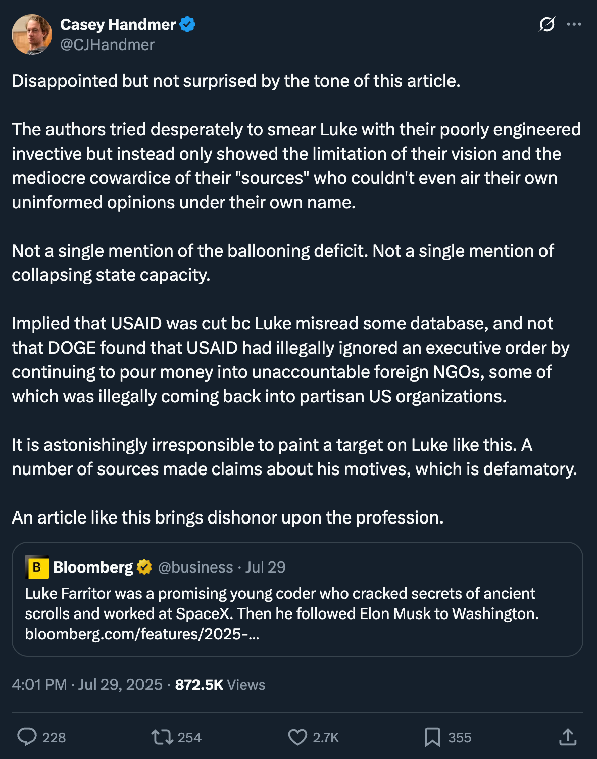 As interesting as the article itself, I would say, was the reaction from the broad universe of Musk-sympathetic tech posters on Twitter. Casey Handmer, a V.C. and Vesuvius Challenge collaborator who was quoted in the Bloomberg piece, complained on Twitter that the article was “irresponsible… defamatory” and “brings dishonor upon the profession” of journalism: