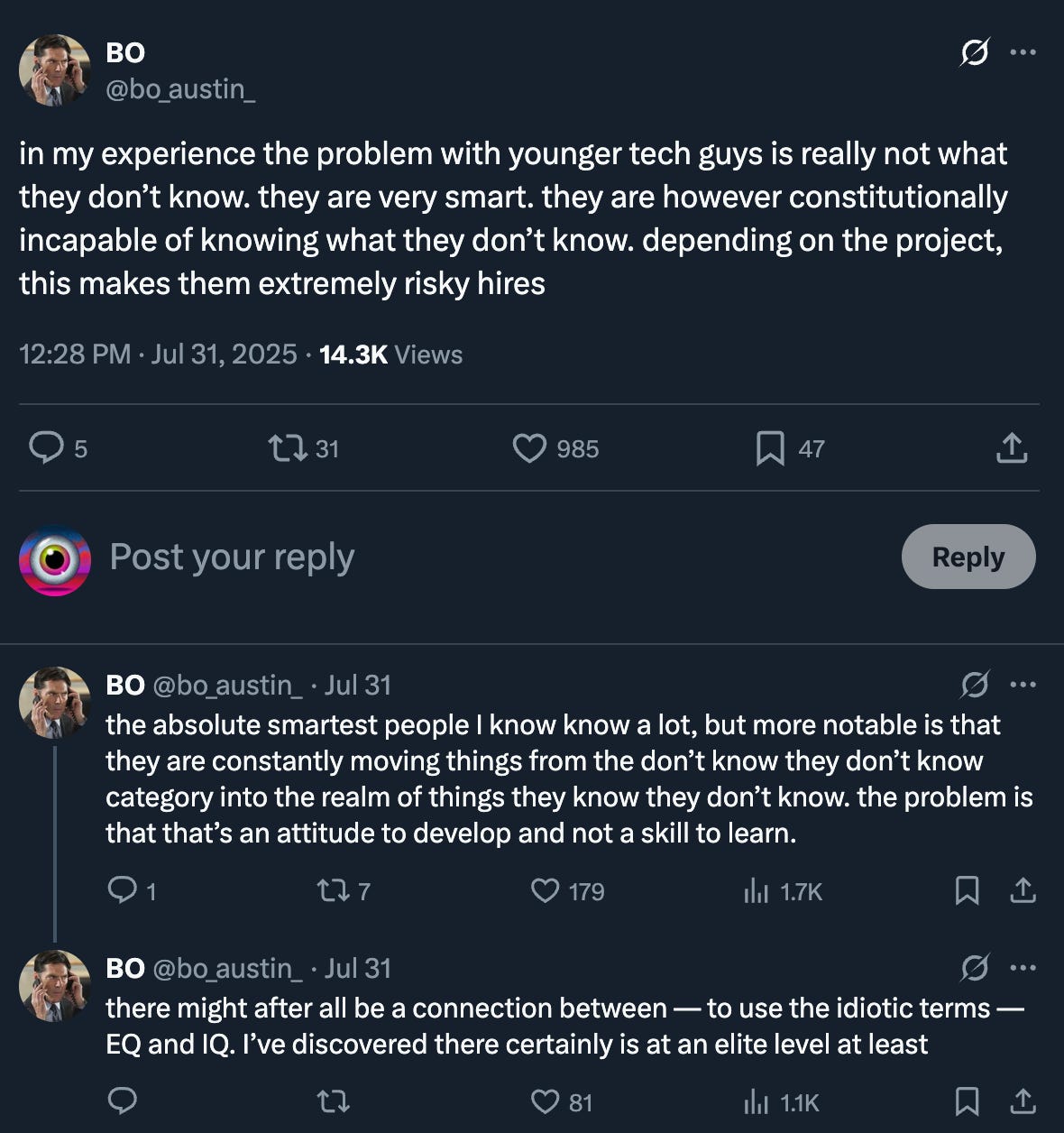 One particularly noteworthy aspect of both the article and the reaction was the way it revealed what I suppose you’d call epistemic arrogance--a total lack of curiosity about how the agencies D.O.G.E. gutting might work, or why a government source might suggest that even an impressive “Python A.I. thing” is not a sufficient C.V. for this kind of government work. These tweets from Bo Austin help get at what I mean: