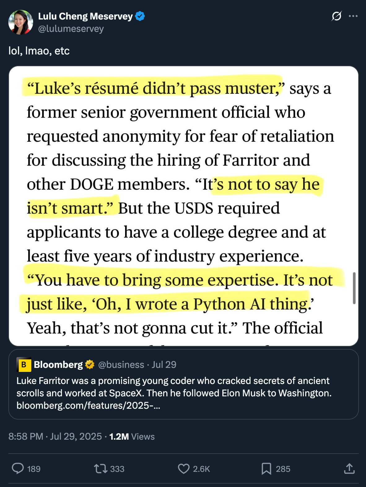 The anti-woke tech publicist Lulu Chang Meservey, meanwhile, singled out for ridiculte an anonymous government source who told Bloomberg’s reporters that “Luke’s résumé didn’t pass muster” because “you have to bring some expertise”: