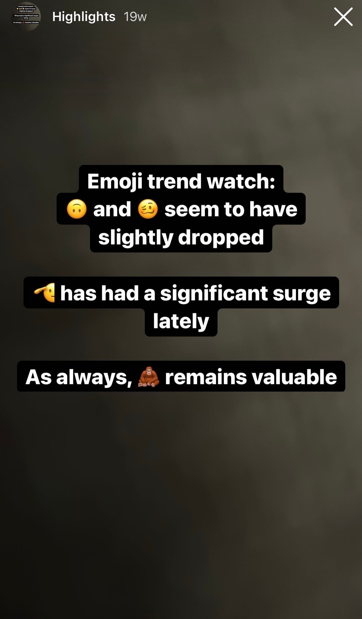 On July 31, I posted my own "emoji trend watch." In lieu of alt text, I'll describe what it says: I believed that the upside-down face emoji and woozy emoji were starting to decline, while 🫡 "had a significant surge lately." I also mentioned that the orangutan emoji "remains valuable." I stand by all of this analysis, and I attribute my foresight to the powers of hydrocodone.