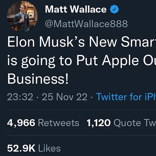 But where most CEOs are dedicated to maintaining smooth relationships with important clients, suppliers, and business partners, Elon Musk is dedicated to other tasks, such as calling CEOs of companies that stopped advertising on Twitter to yell at them, and saying the very first thing that comes to his mind, such as: “if Apple kicks me off the App Store, I will make an alternative phone”: