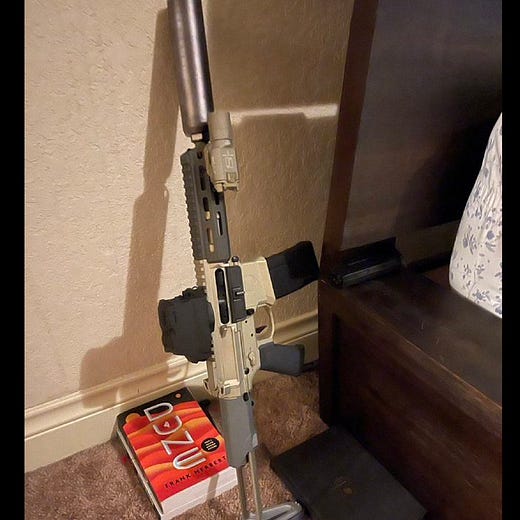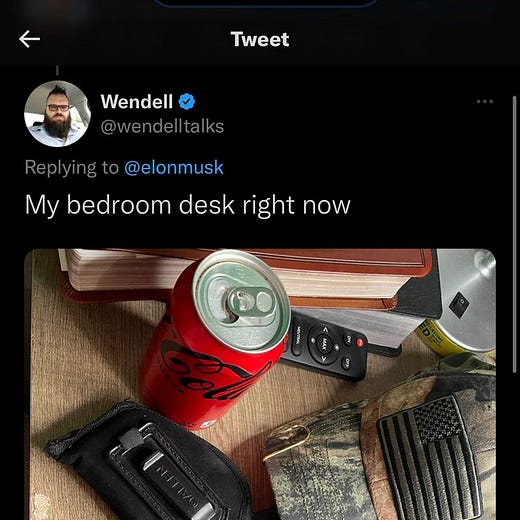That is, for the record, a prop gun in the style of the gun from the video game Deus Ex. And those are caffeine-free Diet Cokes. This is not a bedside-table situation I feel positively about, but it might be better than those of Musk’s most ardent fans: